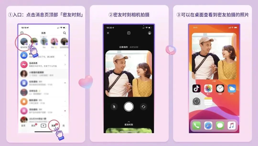 2022年5月,抖音“密友时刻”功能上线,添加朋友为密友后,用户发布的照片会立刻投屏在对方的手机桌面上,支持实时的生活分享。