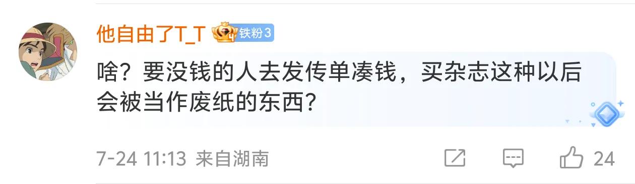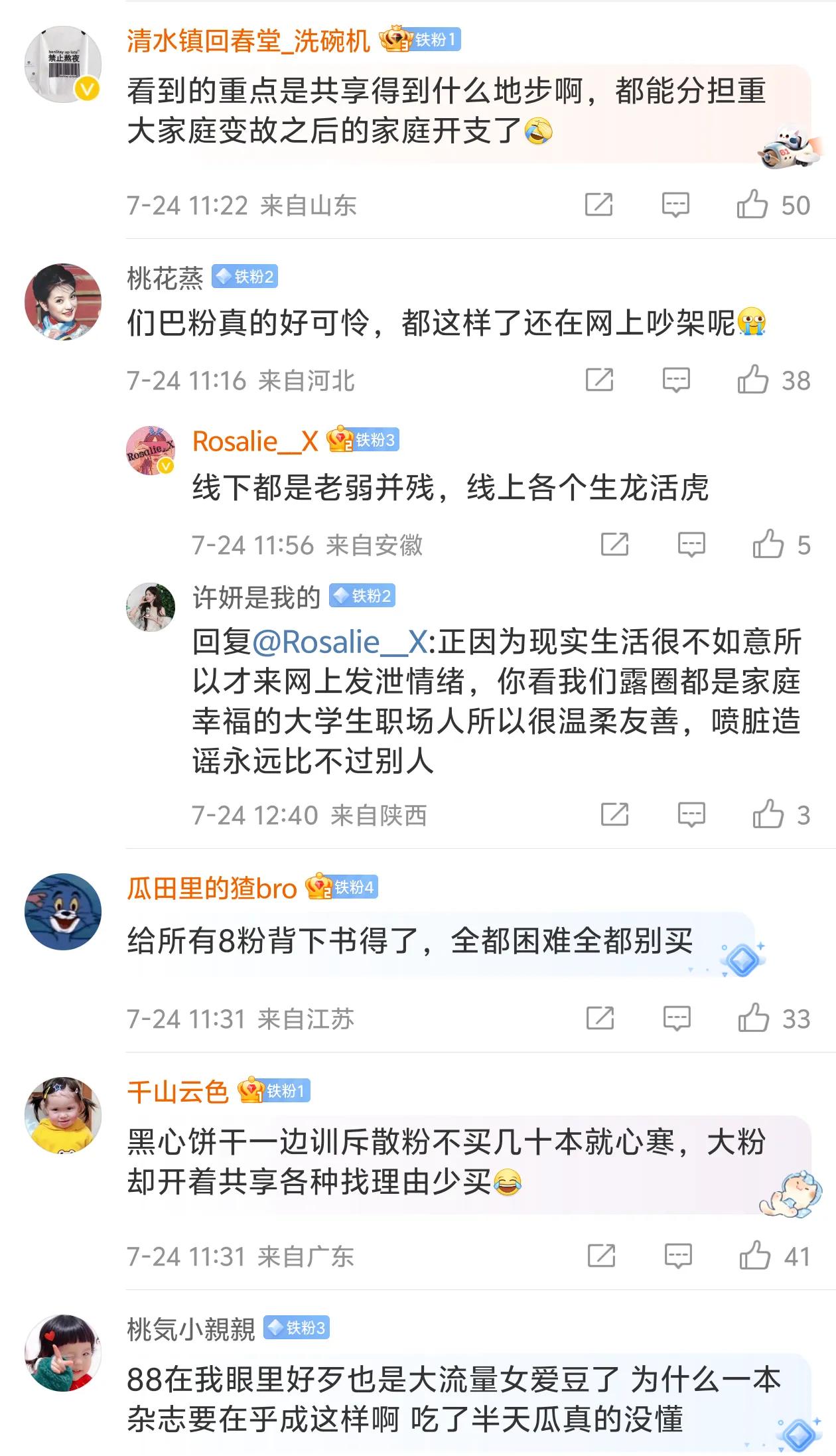 即便是工作党,买十几二十本一模一样的杂志杂志放家里,为了粉圈吹杂志销量没必要。大粉有什么好心寒的。
