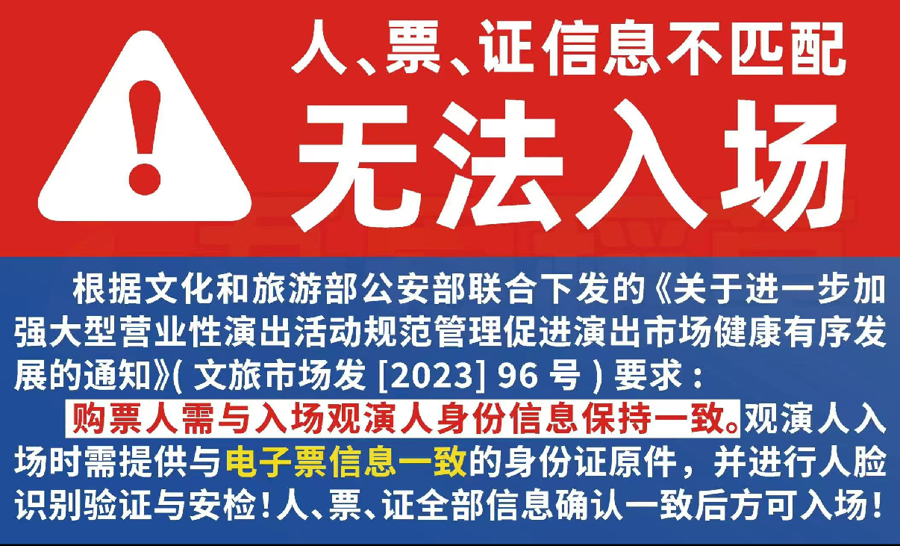 “票、证、人”信息三者合一,被称为“强实名”。2023年9月12日,文旅部、公安部发布《关于进一步加强大型营业性演出活动规范管理促进演出市场健康有序发展的通知》,要求“大型营业性演出活动实行实名购票和实名入场制度,每场演出每个身份证件只能购买一张门票,购票人与入场人身份信息保持一致”。