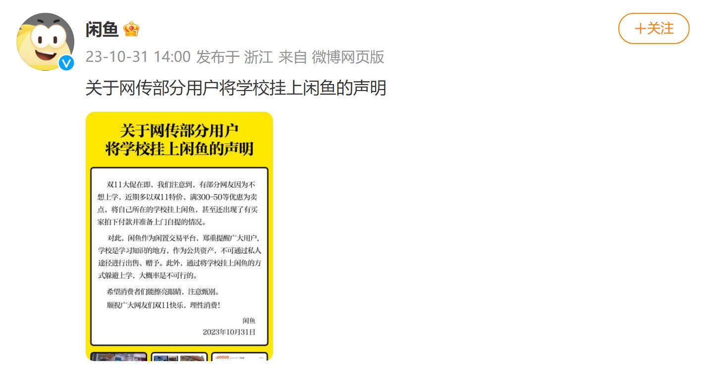 网传部分用户将学校挂上闲鱼,闲鱼官方声明:以此方式躲避上学,大概率是不可行的