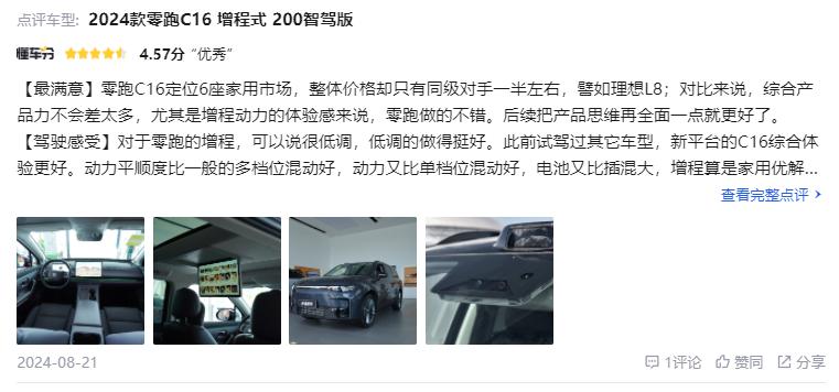 从广大首批车主的日常用车经历分享来看,零跑C16所展现出的口碑表现相当不错。其中智能化、六座布局,以及增程车纯电续航里程够长、纯电车充电效率高,是绝大多数车主给出的评价,最关键的还有目前购车需要付出的成本并不算高。而这些评价透露出零跑C16当前热度较高背后的原因,因此照目前的情况发展下去,零跑C16的市场表现,大概率还会得到进一步的增长。