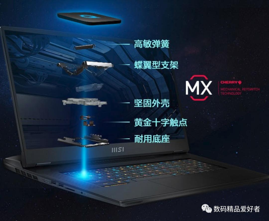 微星泰坦GT77的特色是配备樱桃MX机械键盘,拥有1.8mm的大键程,配备数字小键盘和全尺寸方向键,还支持全景炫光RGB灯效,可以自定义每一颗按键的颜色和灯效。