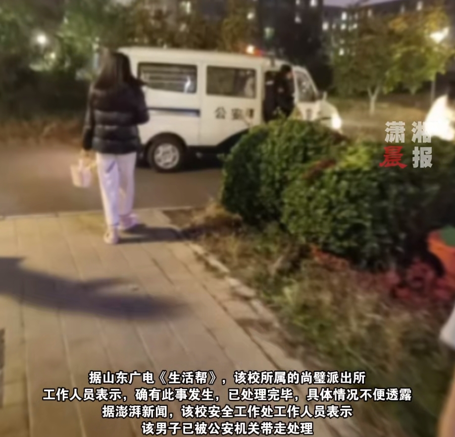 11月4日,潇湘晨报记者致电该校办公室,工作人员表示,不清楚此事,可以咨询校宣传部。随后记者多次拨打该校宣传部电话,均未接通。据山东广电《生活帮》,该校所属的尚璧派出所工作人员表示,确有此事发生,已处理完毕,具体情况不便透露。据澎湃新闻,该校安全工作处工作人员表示,该男子已被公安机关带走处理。