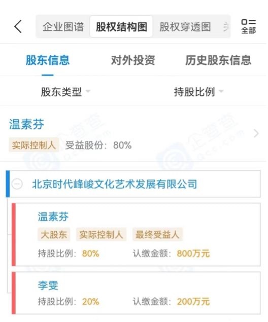 据企查查,时代峰峻背后的大股东分别为温素芬和李雯,持股比例分别为80%和20%,公司法定代表人为陈春会。公司已成功注册“TFBOYS”“TF家族”等多个商标。