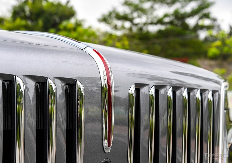 “高山流水”的进气格栅采用竖状镀铬饰条设计,进一步增加了威严。而“气贯山河,红光闪耀”的红色前Logo灯条,也是红旗极具特色的元素。
