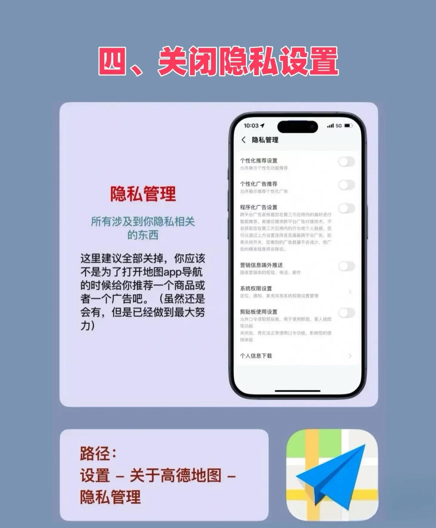 高德地图隐私设置里的选项,建议全关。没人想导航时看到广告,虽不能完全杜绝,但这样能最大程度减少干扰与隐私风险。