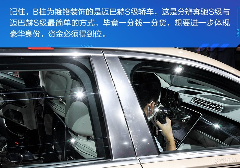 再告诉大家一个分辨迈巴赫S级与奔驰S级的方法,那就是奔驰S级的B柱为全黑配色,而迈巴赫S级的B柱采用镀铬装饰,果然是一分钱一分货,想要更奢华的配置,那必须得多花钱(当然,也不排除淘宝几十块钱就可以改装的奔驰E200L)。