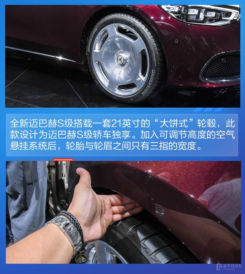 全新迈巴赫S级搭载一套21英寸的“大饼式”轮毂,此款设计为迈巴赫S级轿车独享。实拍展车轮胎为普利司通的泰然者系列,但笔者估计上市之后会换成更高级别的舒适静音胎,由于加入了可调节高度的空气悬挂系统,所以我们实拍的这台迈巴赫S级,轮胎与轮眉之间只有三指的宽度,这更让这台车看起来有一种贴地飞行的尊贵感受。