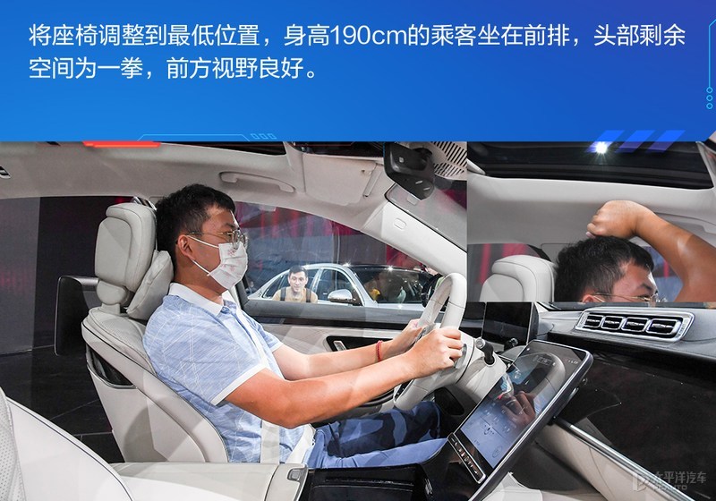 将座椅调整到最低位置,身高190cm的乘客坐在前排,头部剩余空间为一拳,前方视野良好。