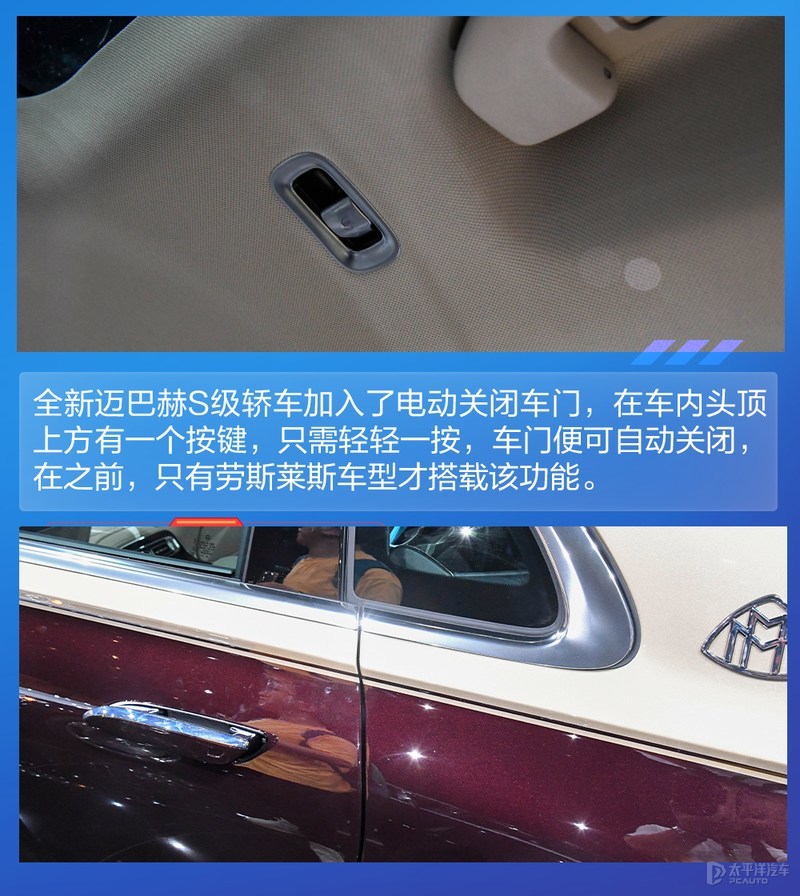 本次全新迈巴赫S级在后排还增加了一个十分高级的配置,那就是可电动关闭的车门,在车内头顶上方有一个按键,只需轻轻一按,车门便可自动关闭,在之前,只有劳斯莱斯车型才搭载该功能。