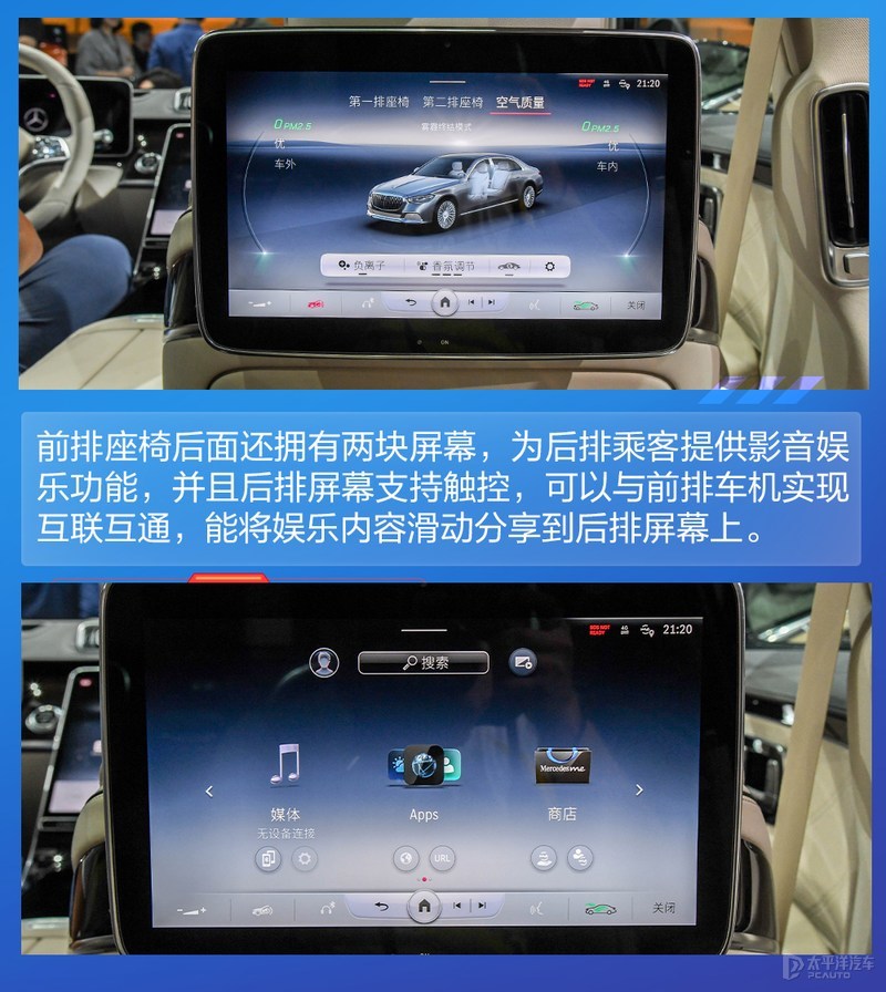全新迈巴赫S级共拥有五块屏幕,除了前排两个外,前排座椅后面还拥有两块屏幕,为后排乘客提供影音娱乐功能,并且后排屏幕支持触控,可以与前排车机实现互联互通,能将娱乐内容滑动后排屏幕上,大大增加使用便利性。