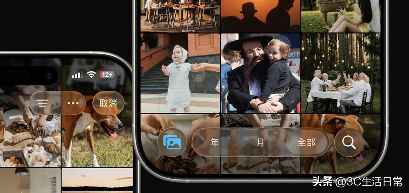 延续 iOS 26 全面升级的 液态玻璃(Liquid Glass)视觉,照片App 的页签列、搜索键、选择键均采用半透明处理,突显照片主体。