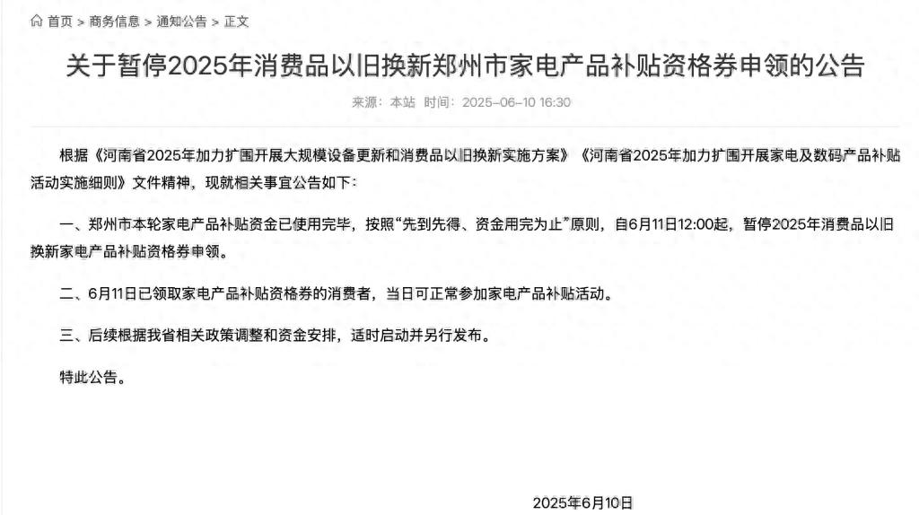 6月10日,郑州市商务局官网发布关于暂停2025年消费品以旧换新郑州市家电产品补贴资格券申领的公告。公告指出,根据《河南省2025年加力扩围开展大规模设备更新和消费品以旧换新实施方案》《河南省2025年加力扩围开展家电及数码产品补贴活动实施细则》文件精神,郑州市本轮家电产品补贴资金已使用完毕,按照“先到先得、资金用完为止”原则,自6月11日12:00起,暂停2025年消费品以旧换新家电产品补贴资格券申领。