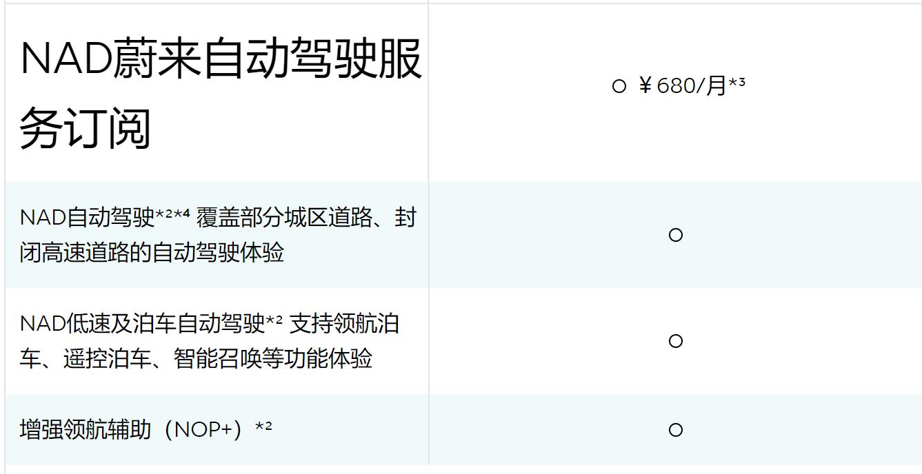 蔚来的NAD自动驾驶服务订阅收费情况,截图来源于蔚来汽车官网