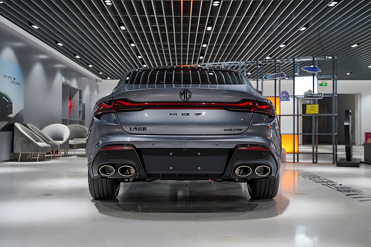 尾部方面,战斗姿态保持的很到位,提供三段式主动电动尾翼,大家可以联想到,这和保时捷Panamera是同款样式,除了好看帅气,同样可以提升下压力。除此以外,MG7还采用官方称之为电磁脉冲造型的贯穿式尾灯组,从而进一步拉宽尾部的视觉效;下方真双边共四出排气,在视觉上进一步突出运动属性,而且这种设计也符合国内消费者,尤其是年轻群体的需求。