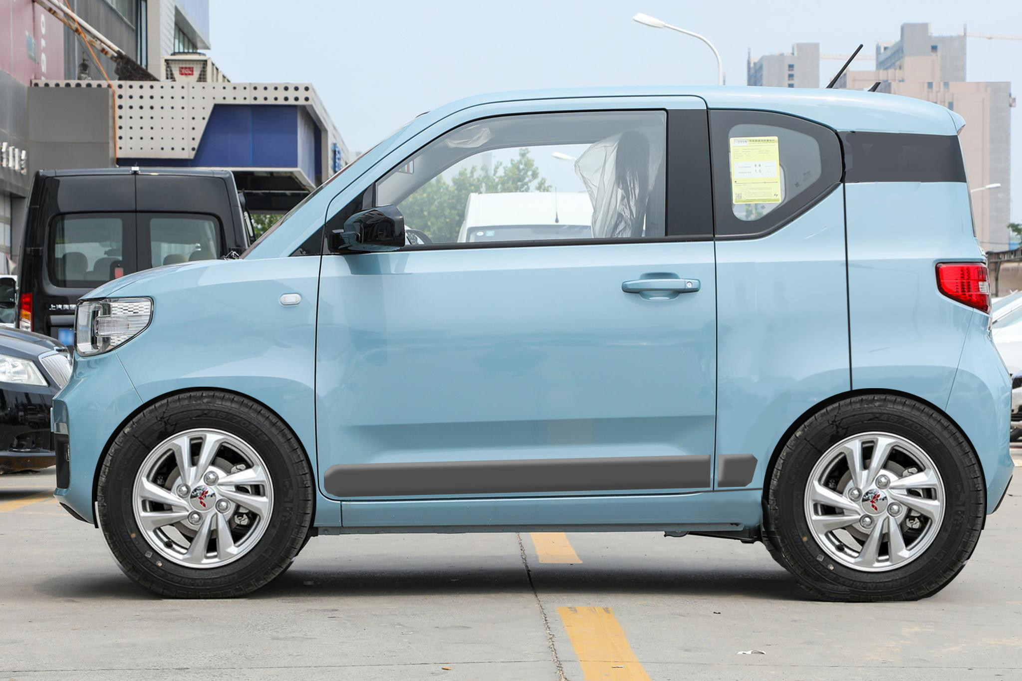车身和轴距在宏光miniEV的基础上加长不少,侧面采用对开门设计,非常新颖又十分实用,后排上下车更方便,车门底部有黑色防擦条,能有效保护漆面,轮胎尺寸加大,通过性增强不少。