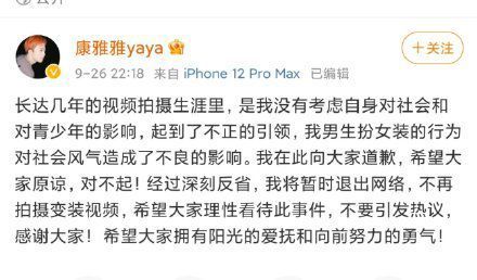 稍晚,“康雅雅”在社交平台上发文道歉,他表示自己没有考虑到自身对社会和青少年的影响,男生扮女装的行为对社会风气造成了不良的影响,将暂时退出网络,不再拍摄变装视频。
