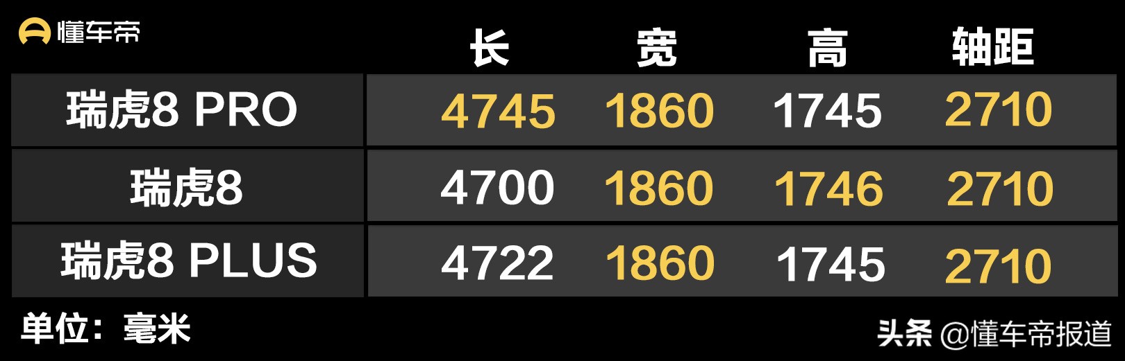 瑞虎8家族三款车型车身尺寸对比