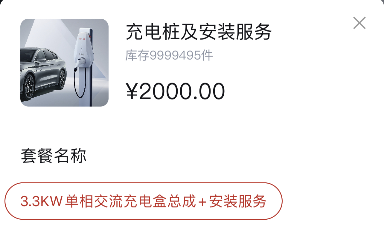 而且还要注意,领先型是不带充电桩的。只有120KM续航的超越和卓越型才送充电桩,3.5KW的充电桩官网的价格是2000块钱。