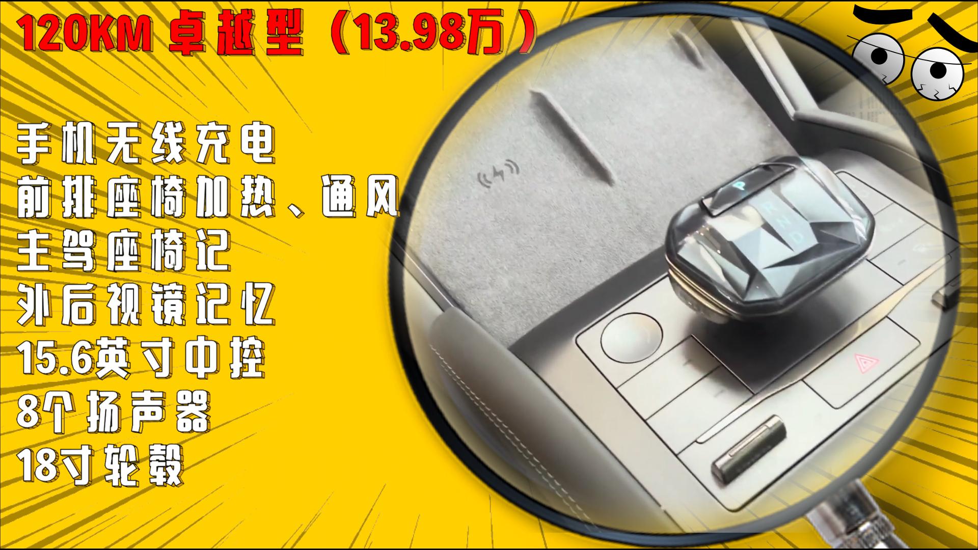 而120KM续航版本又分成了领先型,超越型和卓越型。咱先看11.98万最入门领先型的配置,这车配备了定速巡航、前后雷达、360影像和透明底盘、全车6安全气囊、6扬声器、全景天窗、8英寸的液晶仪表和12.8英寸中控、双区空调、前排座椅电动调节,而且120KM版本开始支持快充。作为一款家用代步车来说,我认为这个版本的配置基本够用,但是现在主流的那些安全配置缺失严重,这是该版本最大的短板。