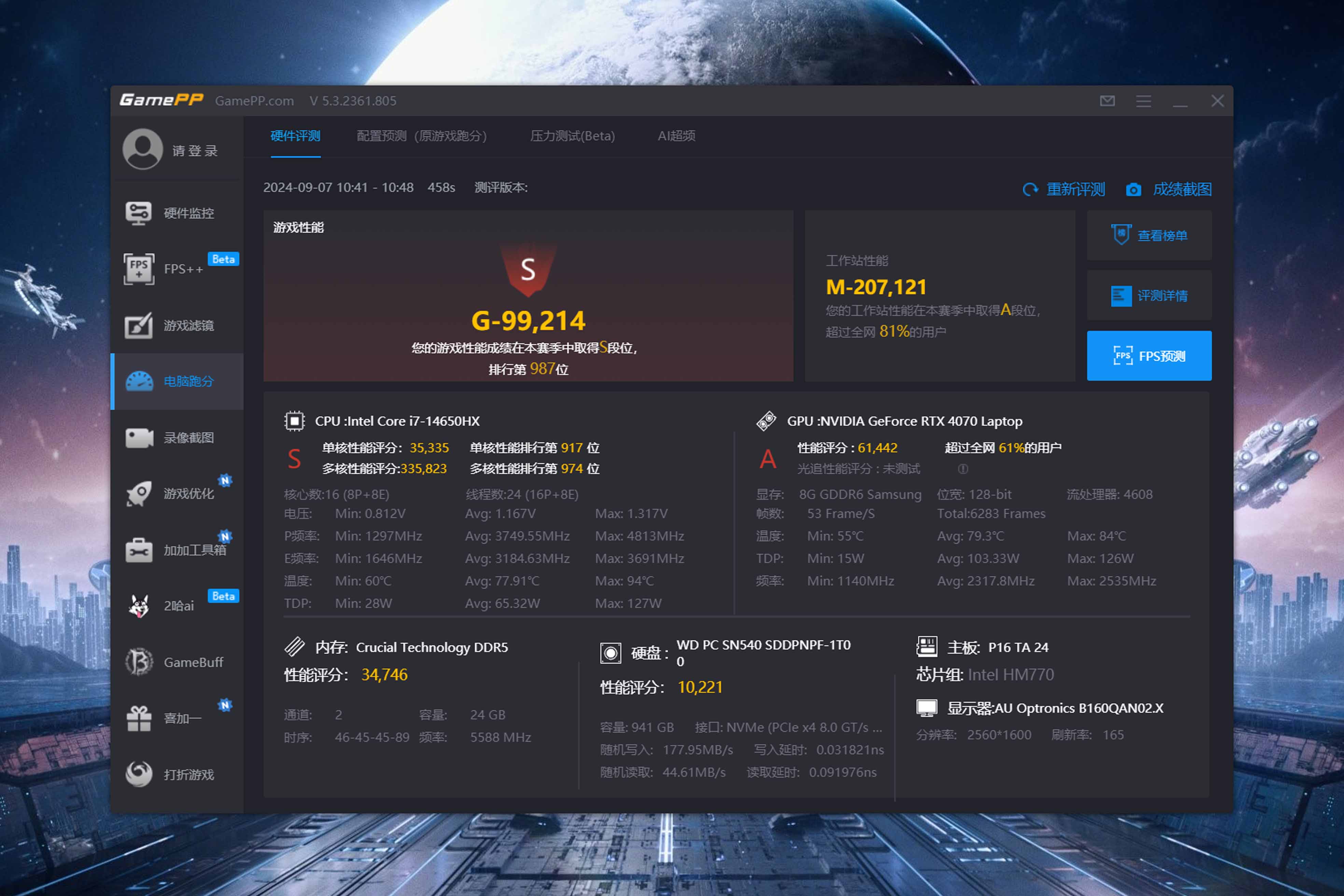 ● 游戏性能得分为99214