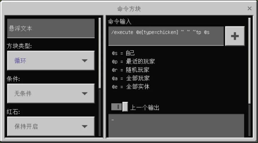 在最后一个命令方块中输入/execute @e[type=chicken] ~ ~ ~ tp @s同样的,方块类型设置为循环,条件为无条件,红石设为保持开启。