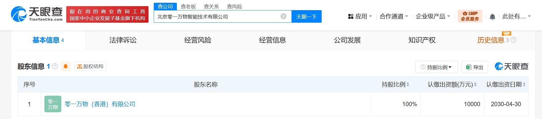 每经AI快讯,天眼查App显示,近日,北京零一万物智能技术有限公司成立,法定代表人为马杰,注册资本1亿元人民币,经营范围含软件开发、人工智能基础软件开发、人工智能应用软件开发、计算机系统服务、人工智能双创服务平台、人工智能理论与算法软件开发、人工智能通用应用系统、人工智能公共数据平台等,由零一万物(香港)有限公司全资持股。