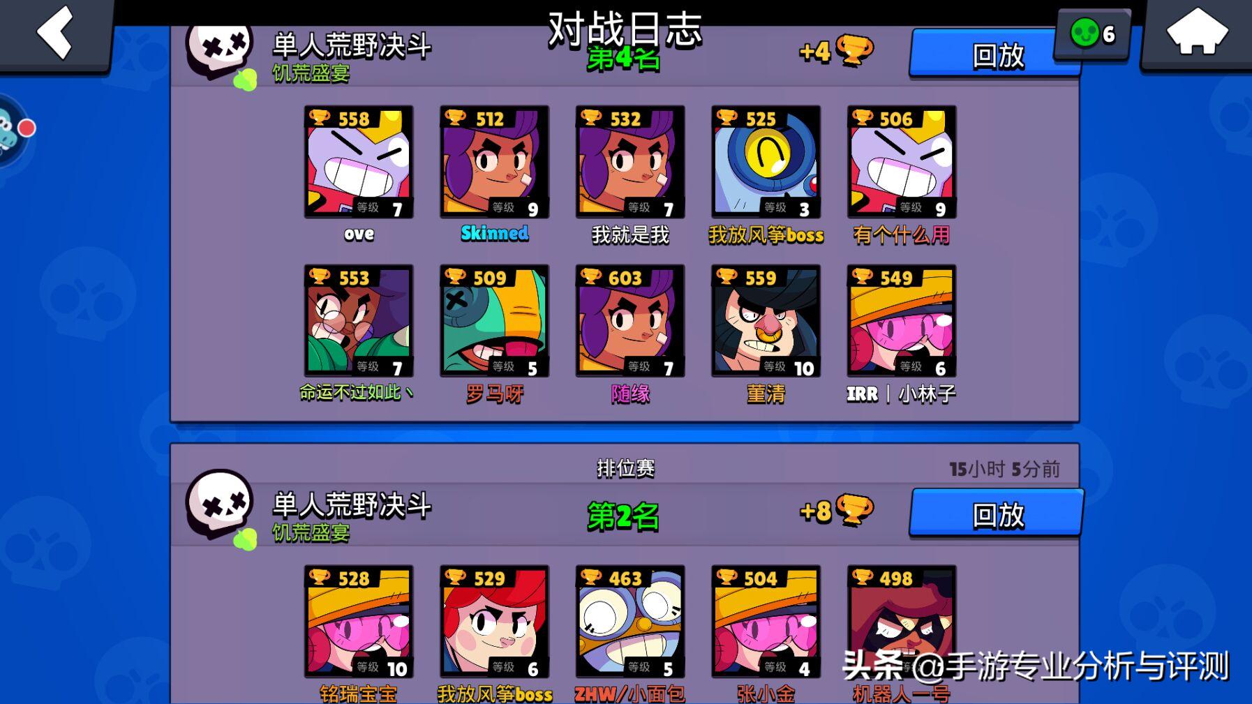 新获得英雄时,低排名(或输了)的惩罚机制很轻,拿个100多杯轻轻松松。为了控制游戏寿命,促使玩家氪新英雄或养成英雄,随着英雄杯数越来越高,低排名(或输了)的惩罚机制越来越重,匹配的玩家级别和类型会波动较大。如上图两场对局,对手队伍整体等级比我们高,英雄类型搭配更合理。这是Supercell向氪金妥协和促使玩家开黑的设定,也是《荒野乱斗》玩家流失的原因之一。所以我主要玩单人荒野决斗,双人和三人玩得少。