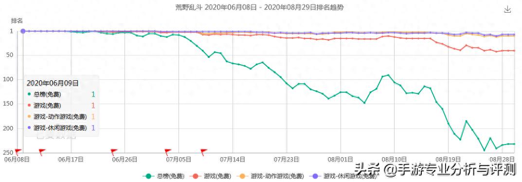 《荒野乱斗》国服于今年6月8日上线,日子很吉利,游戏表现也是一飞冲天,连续3周保持在苹果游戏总榜的前5,可以说是当时的国民级手游之一。