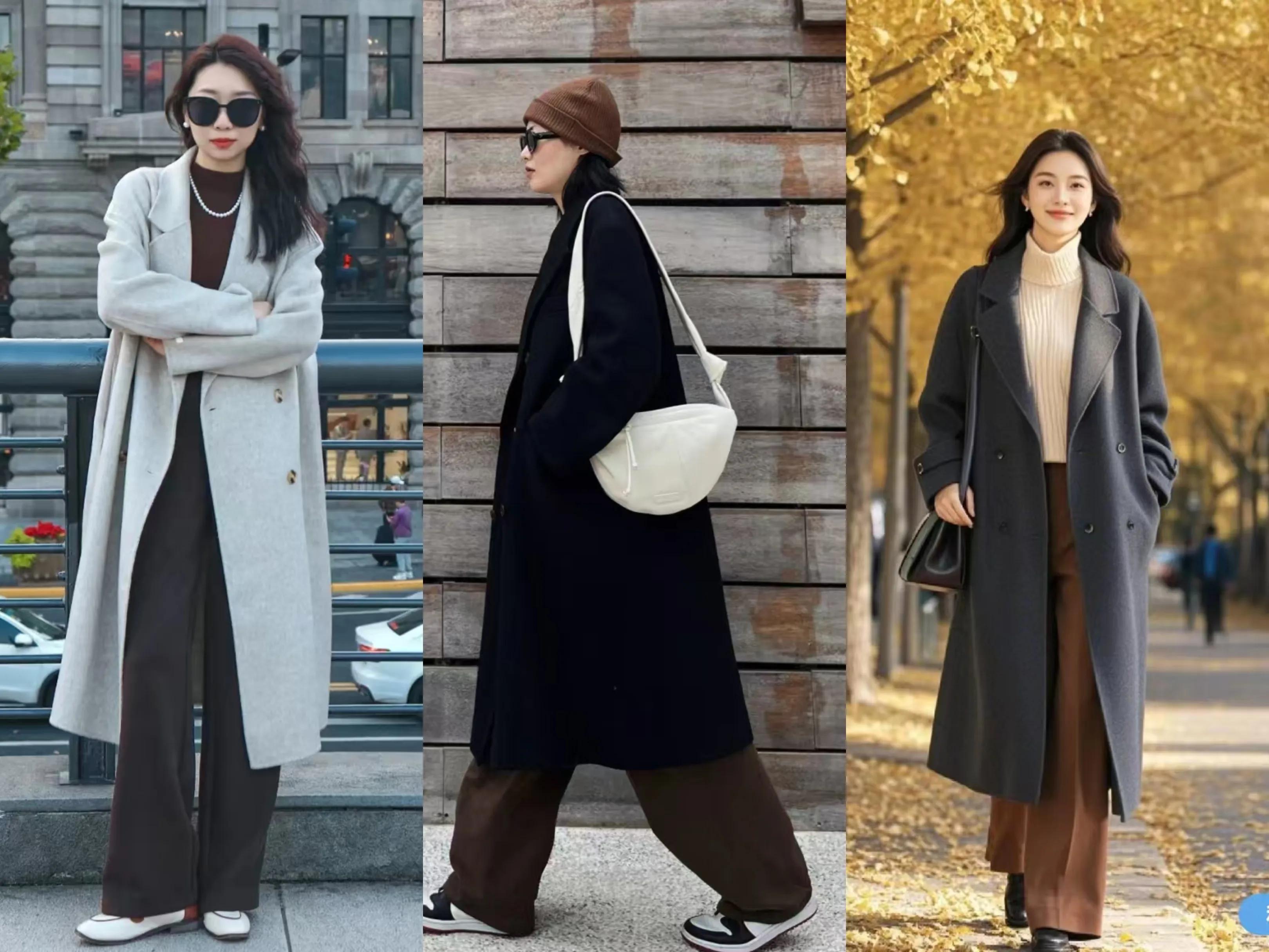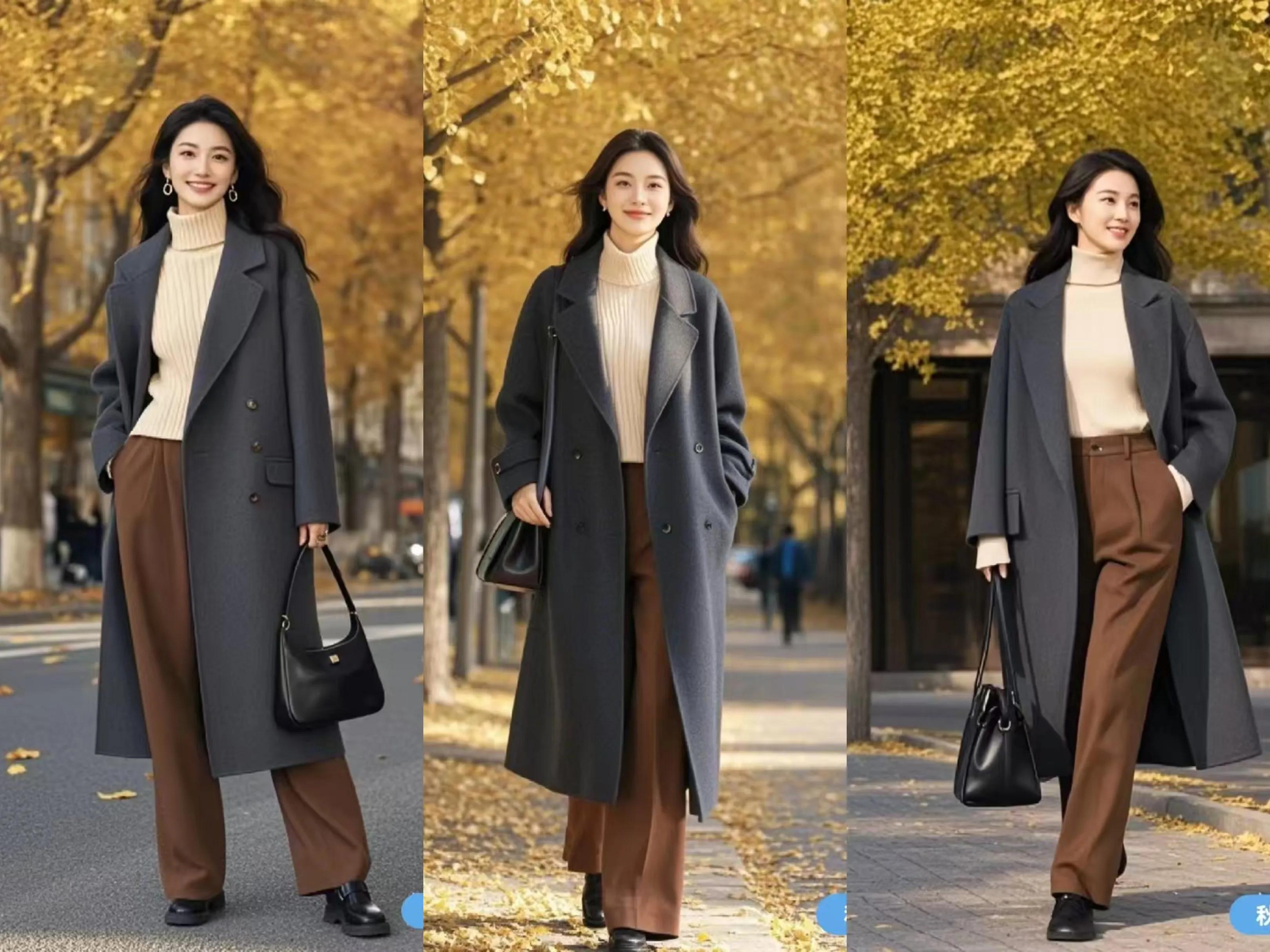 优雅气质:要是棕色直筒裤和米色大衣搭配,整体呈现出成熟女性的优雅气质。鞋子宜选择带跟靴子搭配,气质匹配,造型更好看时尚。