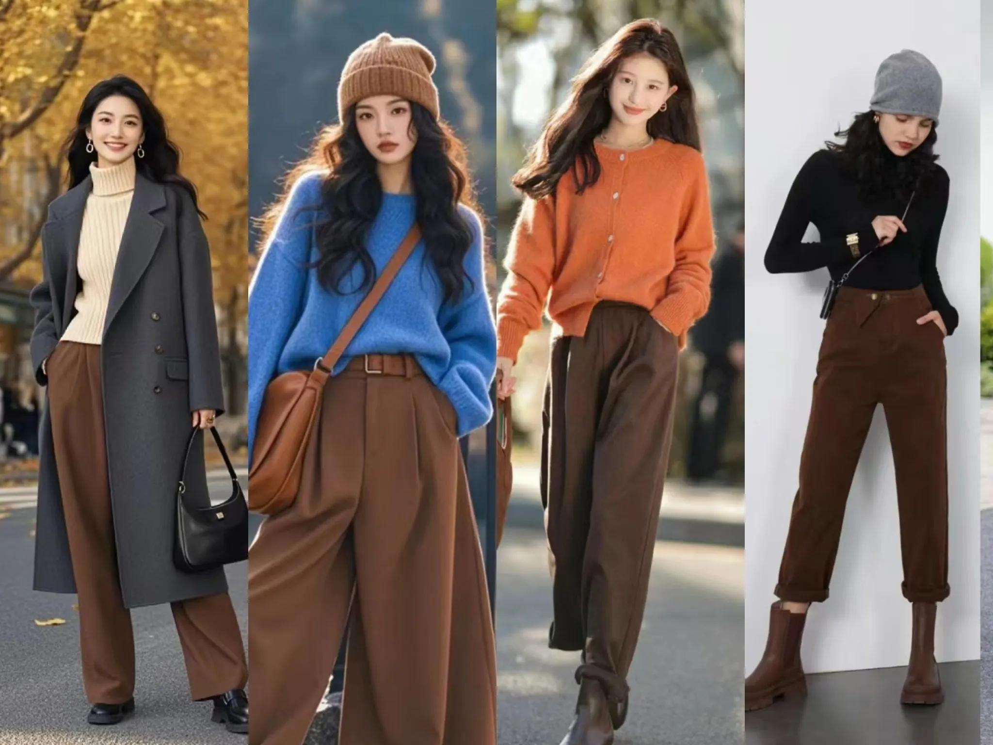 秋冬季节的棕色裤子,有不同的款式。不同款式的裤子,搭配秋冬不同颜色和不同款式的外套,比如毛衣、卫衣、西装、大衣、羽绒服等,展现出不同的时尚气质。
