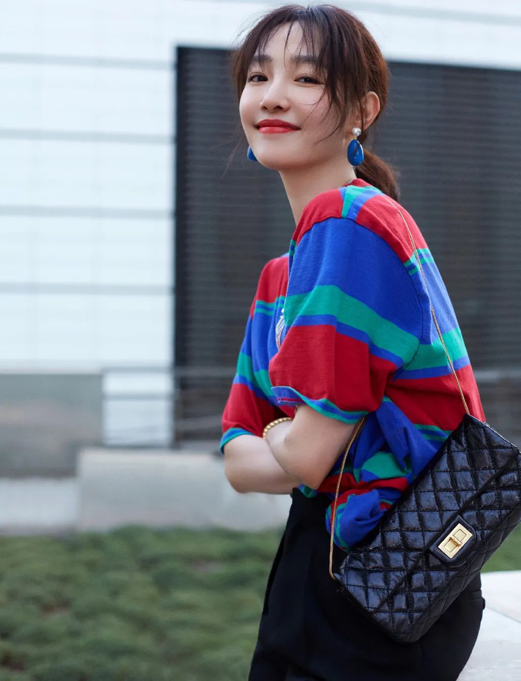 因为彩色条纹本身就比较花俏,所以其他单品尽量搭配简洁的纯色,整体造型有主有次才更好看。