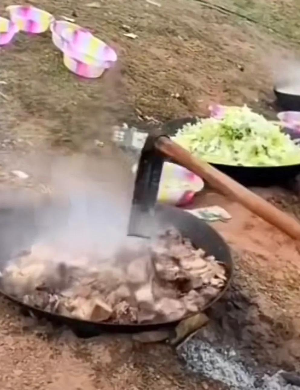 ➡还有更厉害的,煮饭的直接把除草的锄头都用上了,这怎么可以拿来煮东西吃,真的是没有想到,看视频的时候肉掉地上了,也直接把它捡起来再扔锅里面继续煮,真的没有当地卫生部门管一下?至少给个卫生标准吧,这样吃下去,没病都吃出病来了!