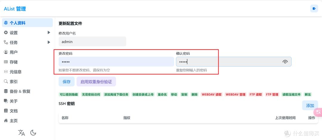 进来之后的第一步就是在“个人资料”这里更改下密码,咱们的Alist就算部署完成了。