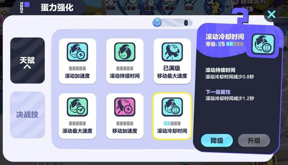 还有一个很直接的提升方式,就是“蛋力强化”,通过等级的提升,我们能为蛋仔装配更多的天赋点和技能。天赋的话,小编的建议是多点移动速度和滚动冷却时间,将加平地超前和滚动超速的收益拉到最大,因为比赛中经常会出现被别的蛋仔撞,或者躲不开障碍的情况,这时候最基础的属性才是制胜法宝!技能更是不分好坏了,只要会用,用得好,每一个都能打出不错的效果,所以熟练度是关键!希望大家找到自己喜欢的战斗方式哦!