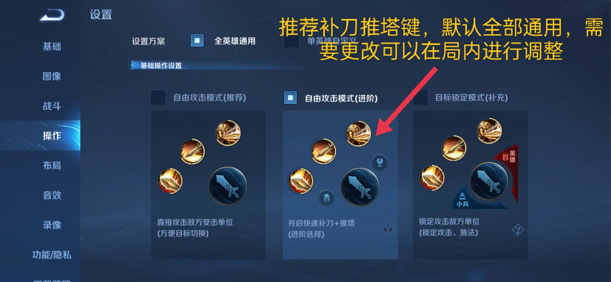 接下来到操作设置,优先选择全英雄通用,推荐补刀推塔键关键时刻就不会A兵或者打到敌方英雄。