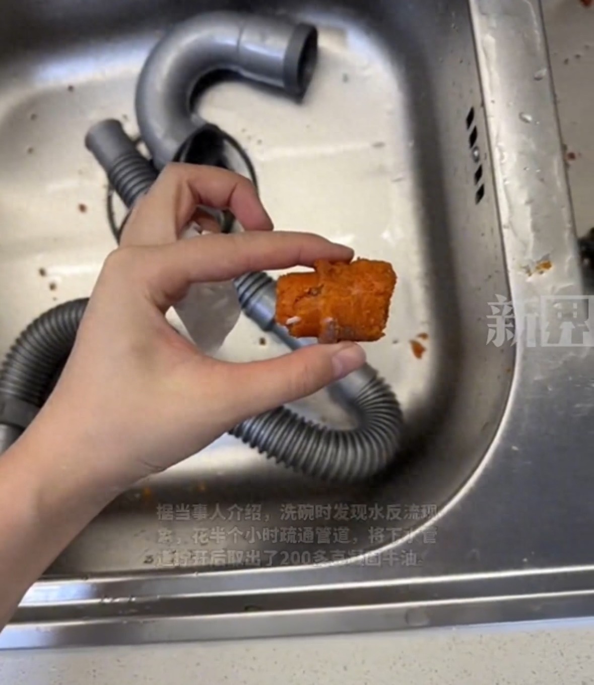 11月3日,重庆。女子将吃剩牛油火锅汤倒入下水道,导致下水管道堵塞反流,花费半小时疏通管道,将下水道拧开后,取出200多克凝固牛油。