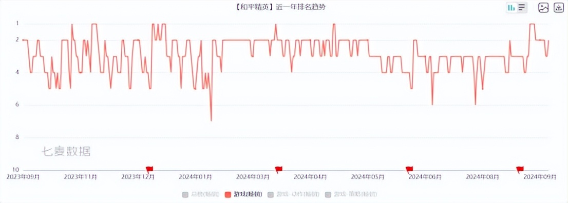 相比之下,七麦数据的折线图看起来或许更为直观。在过去一整年,《和平精英》大部分时候都是位列畅销榜前三,上下波动小。纵观市面上的大部分头部产品,你都很难找到类似长期逆生长的案例。笔者认为,这离不开《和平精英》在游戏内容和商业化运作上的双轮驱动。