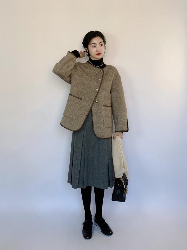 深棕色毛呢小香风外套+灰色衬衫和同色系的西装百褶裙,服帖的肩膀和袖口设计搭配造型顺畅的褶裙,既显瘦又自然。