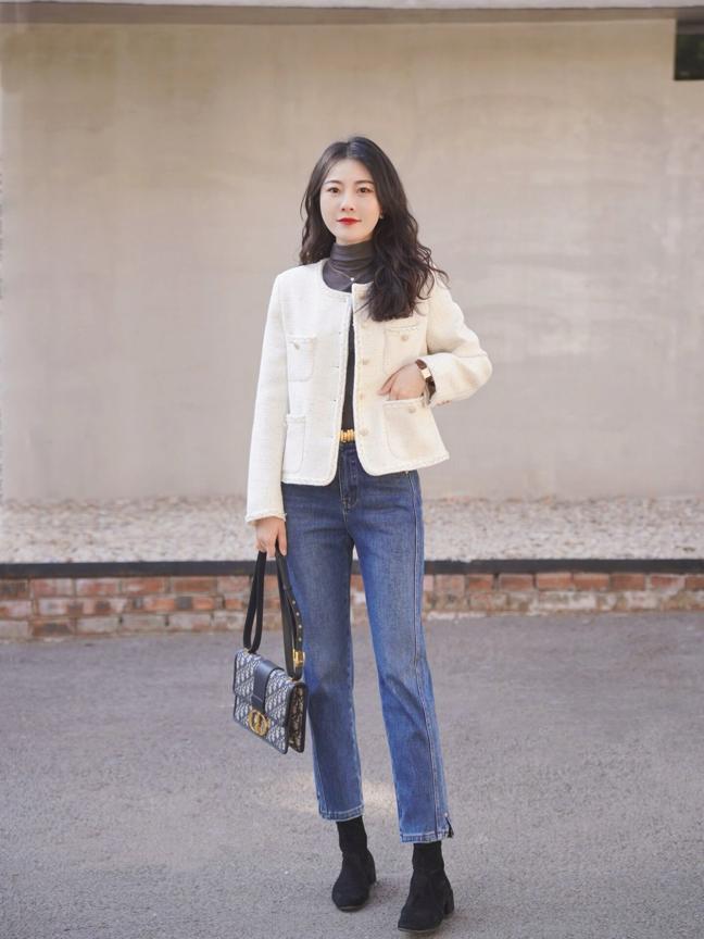 米白色短款小香风外套,搭配深蓝色牛仔七分裤和深灰色绒面细筒短靴,在冬季选择米白色外套,可以有效提升皮肤的光泽度,搭配上修长的牛仔裤和纤细的鞋型呈现出清爽的状态,好评。