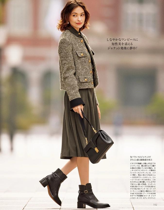 深棕色镶边小香风外套,搭配深灰色高腰毛呢半裙和黑色漆皮感玛丽珍鞋,这里的棕色小香风外套在肩膀处的设计有些臃肿,即便是选择了稍微大一些的尺码,也没有突出女性的轮廓感。