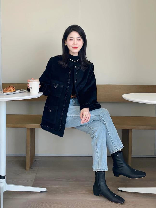 深蓝色绒面重工小香风外套,搭配水洗蓝灰色牛仔高腰七分裤和黑色方头软皮短靴,华丽稳重的深蓝色绒面如同星空一样神秘优雅,与温润的皮革短靴组合呈现出从容雅致的氛围。