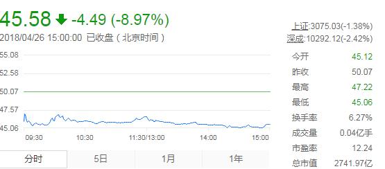 今日开盘,格力电器股价低开9.89%,开盘价报45.12元,一度逼近跌停。截至中午收盘,报46.65元,跌幅6.83%。这一现象引起深交所关注。