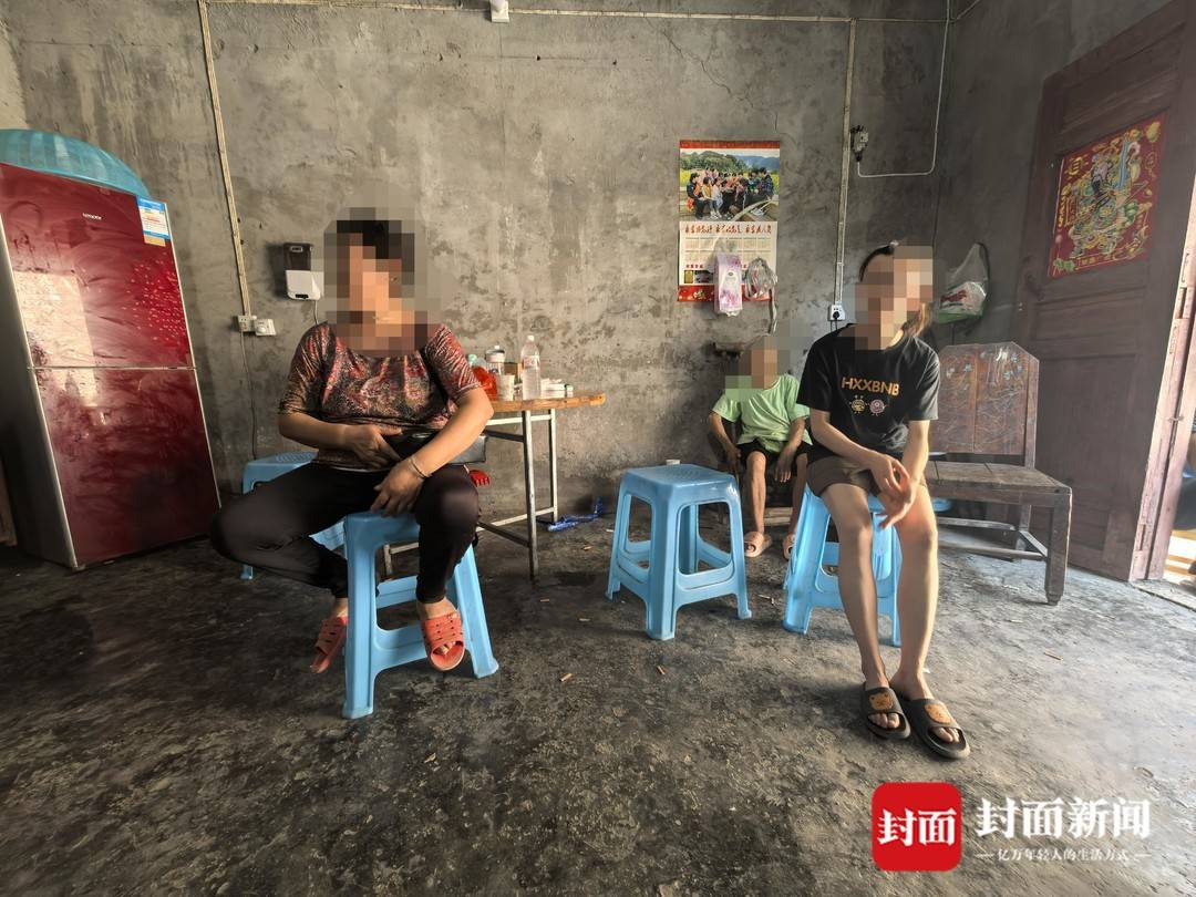 李声腾的母亲和妻子坐在家中。