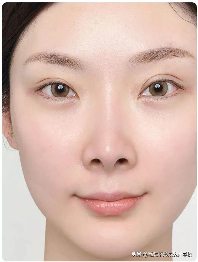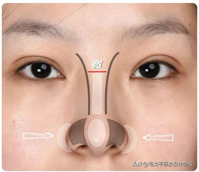 那么你化妆的时候就要注意不能拉近眼距,因为眼距的宽度和鼻翼的宽度会形成一个对比,两者之间的差距越大,显得鼻子就越大。