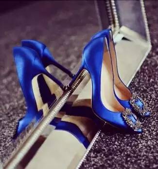 靛蓝色牛仔布圆头高跟鞋,高雅时尚,但没有尖头的性感,不过这款适合脚大的妹纸,由于尖头的会更显脚长~
