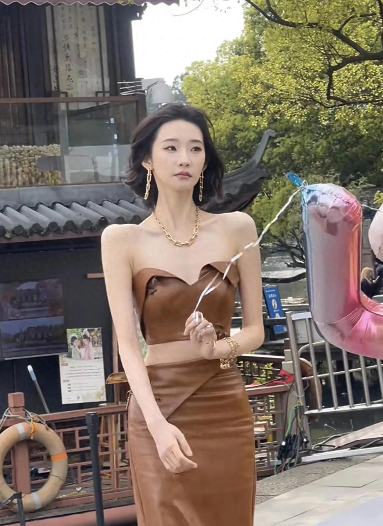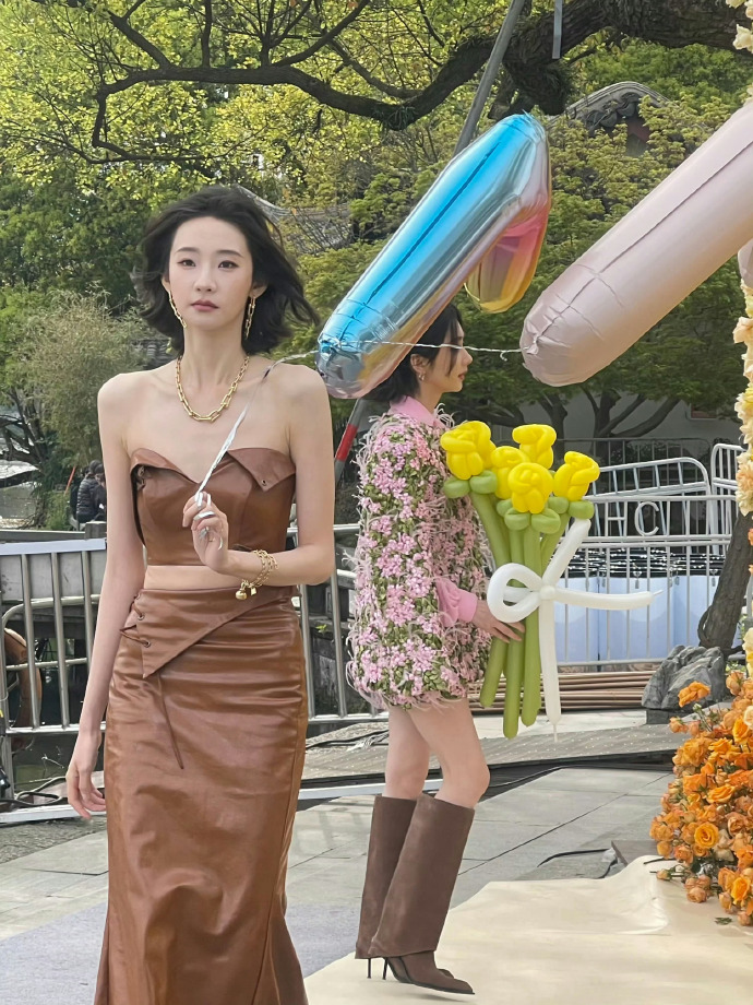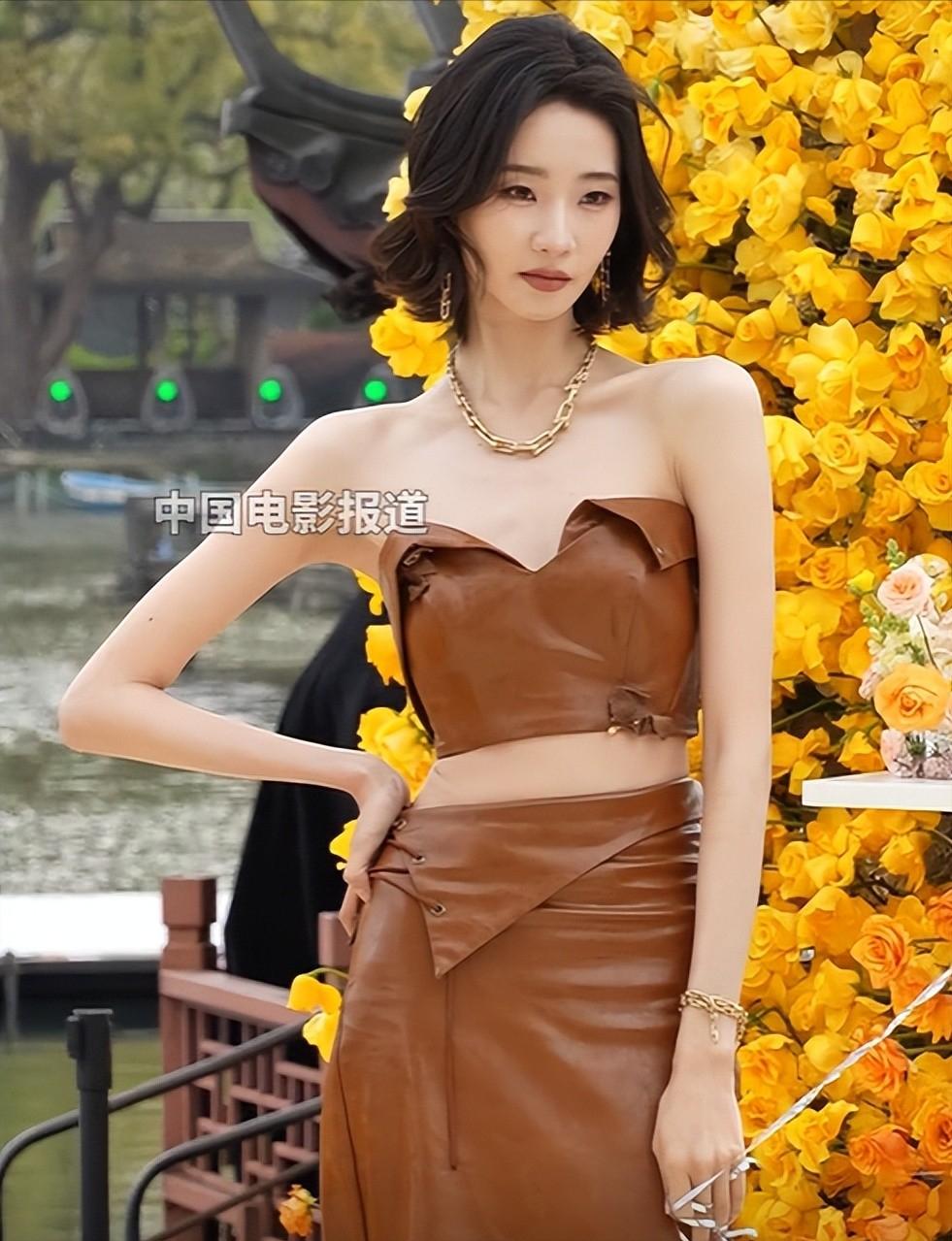 这一次走春天开幕式红毯的她,一改过去甜美清纯的风格,以一身酷飒的抹胸皮裙套装登场,搭配短发干净利落,戴上金链金手链金耳饰显得珠光宝,真是人群里打眼的存在。