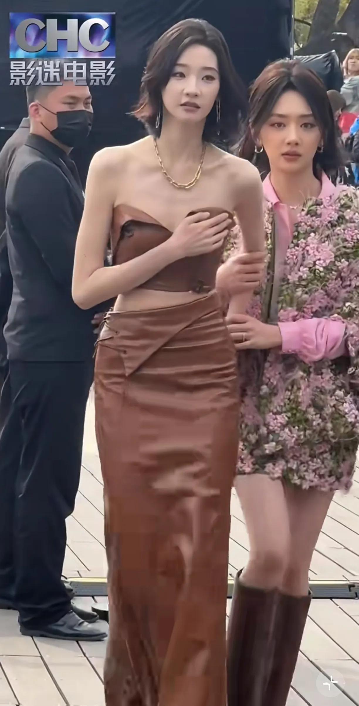 难怪一起出场的王影璐都要搀扶着她走红毯,不仅因为她穿高跟,还因为太瘦了。