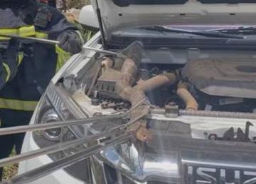 在赶往现场之后,消防队员们确实在报警人所称的皮卡车当中发现了一条蛇类的身影,并且这条蛇还被卡在了汽车的引擎当中。