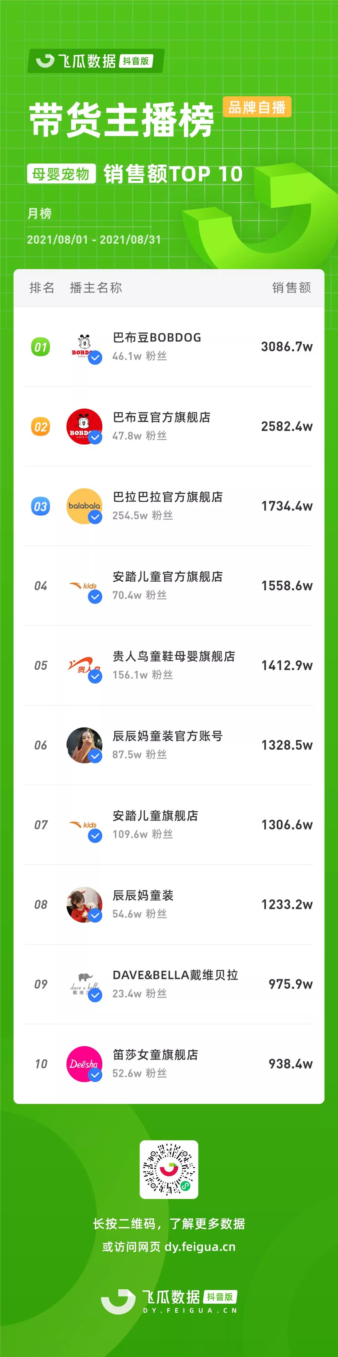 另外我们注意到,运动户外top10几乎被品牌自播号霸榜。对此飞瓜数据也生成了品牌自播号的带货月榜。